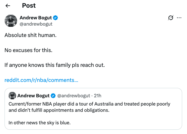 Australian basketball legend has hit out at the former NBA star on social, calling him a sh*t human.